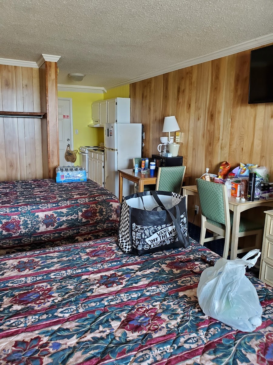 My daughter and I really enjoyed our stay here. Beach front motel, in good repair and very clean. Our room had a full kitchenette - stove, sink, full size refrigerator, microwave and coffee maker, which suited us, since we don't like to eat out every meal. Stayed in May at a very reasonable price for ocean front. Will definitely come back.